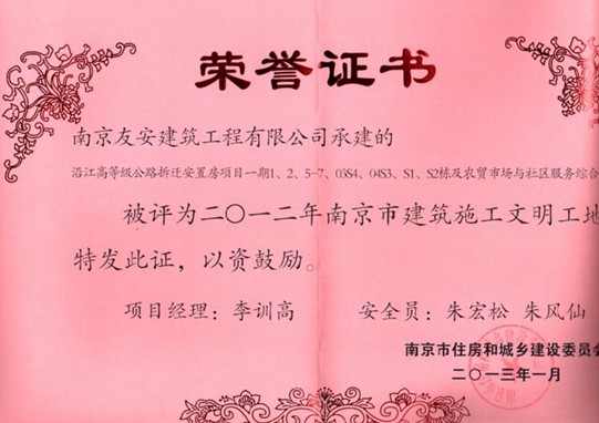 由南京友安建筑工程有限公司承建的“沿江高等级公路拆迁安置房项目一期及社区服务综合楼”荣获2012年度南京市建筑施工“文明工地”奖。